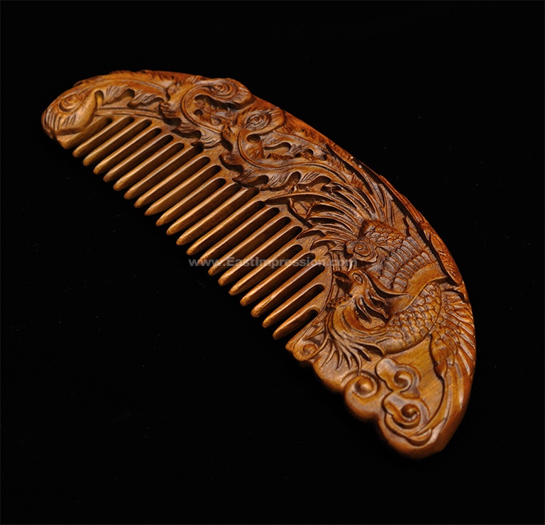 在古代神话传说中,凤凰是一种象征吉祥、和谐与尊贵的神鸟。凤凰于飞,祥云朵朵,将其图案双面精雕细琢于梳背之上,纹饰细腻精致、繁复优美。