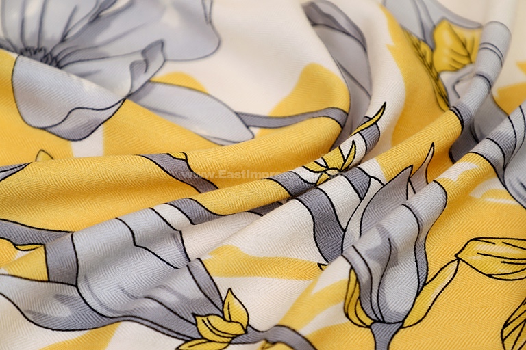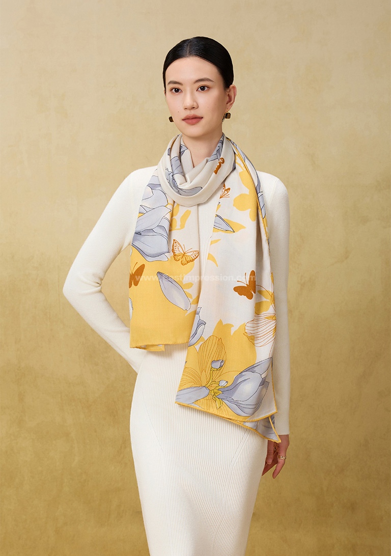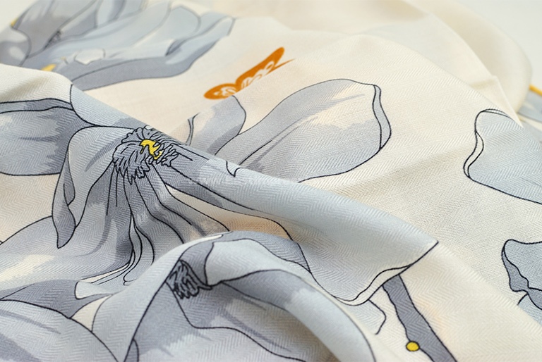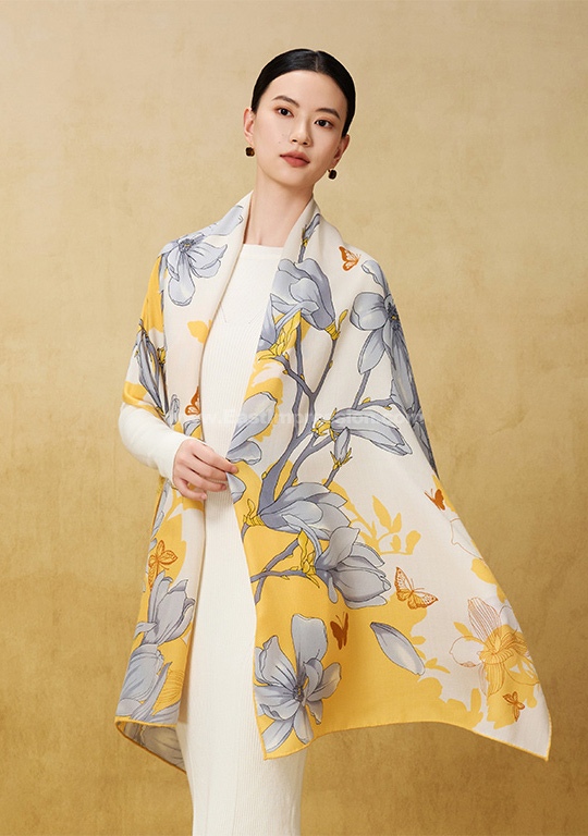 米白的底色上,明亮的鹅黄引人注目却并不张扬。玉兰花枝干与花朵以灰色调呈现既平衡了鹅黄的亮丽,又契合玉兰花玉骨冰姿的孤傲。几只蝴蝶蹁跹花间,棕色调用以点缀。图案及色彩的搭配冷暖相宜,颇具清新文艺范。