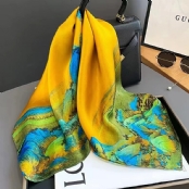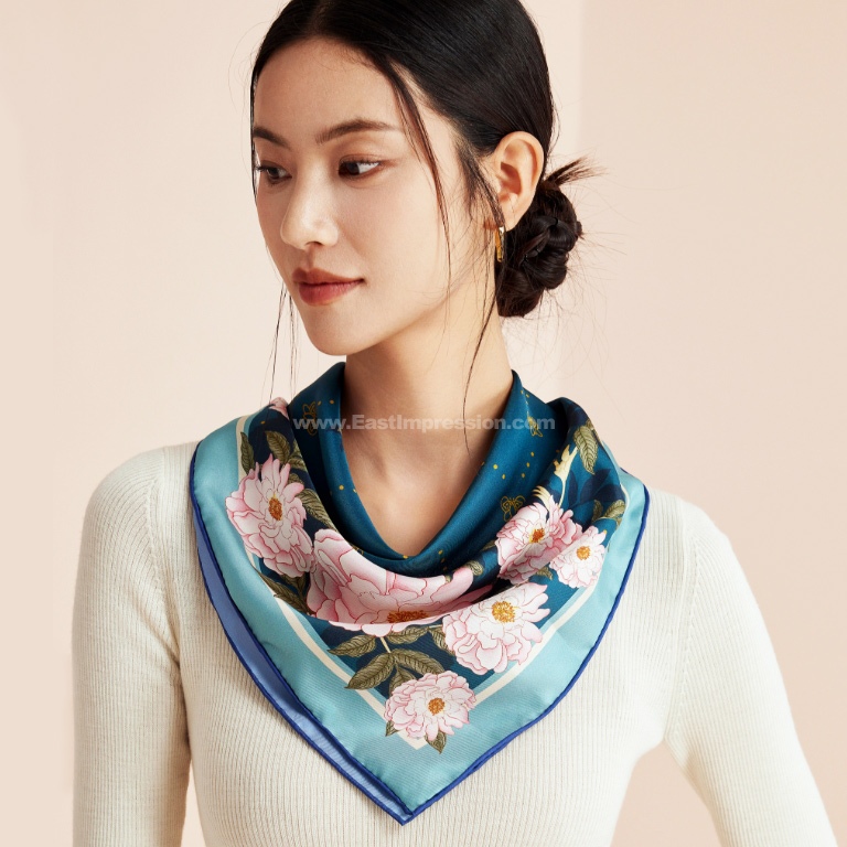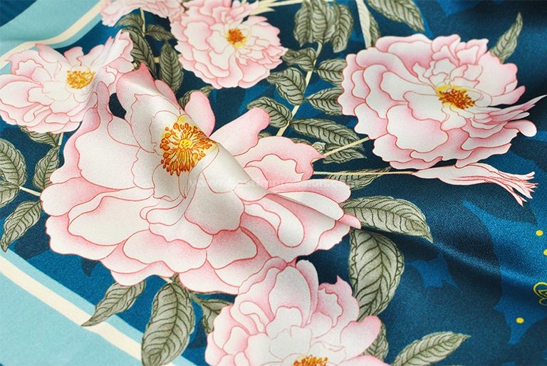 丝巾面料为14姆米真丝素绉缎,散发出自然柔和的丝绸光泽,表面平整光洁,触感细腻丝滑。