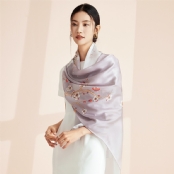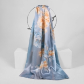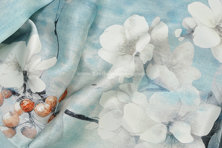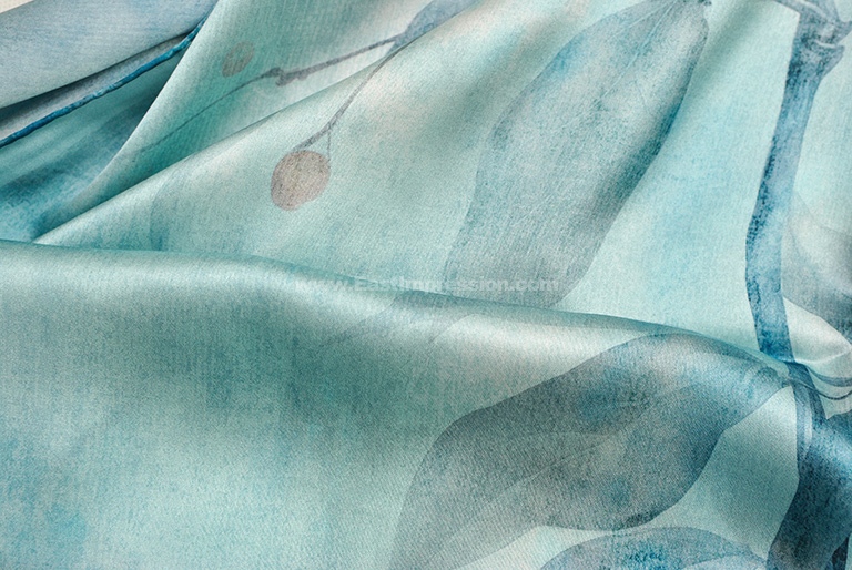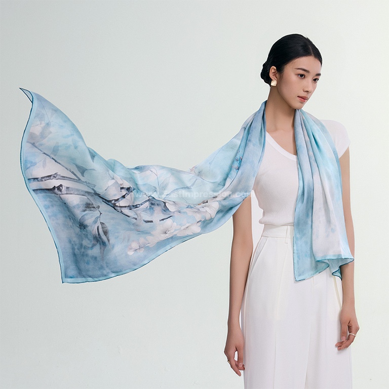 丝巾面料为14姆米真丝素绉缎,散发出自然柔和的丝绸光泽,表面平整光洁,触感细腻丝滑。