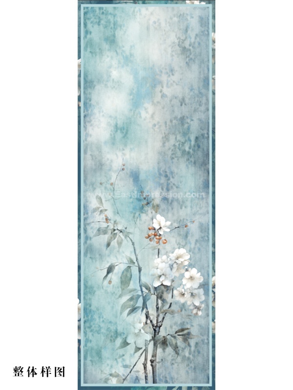 以中国传统色“云门”为主色调,山茶植株的花枝叶虚实相生,取天际初明时的朦胧色调,具有空灵缥缈之感,体现了中国传统艺术“留白生韵”的审美理念。