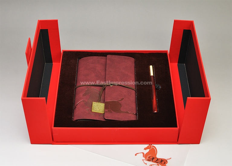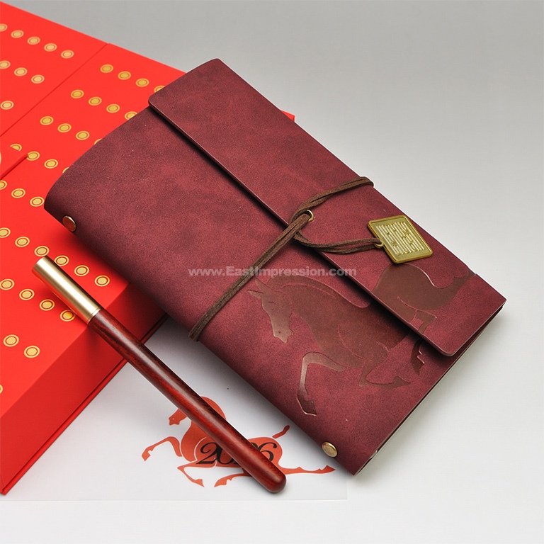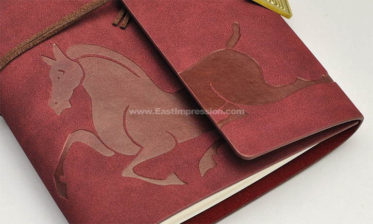 笔记本封面的汉马形象由“马踏飞燕”衍生而来,压印工艺在高级变色皮革上立体呈现出一匹深棕色的汉马,一马当先,奋发向上,豪迈进取的汉骑雄风展现在眼前。