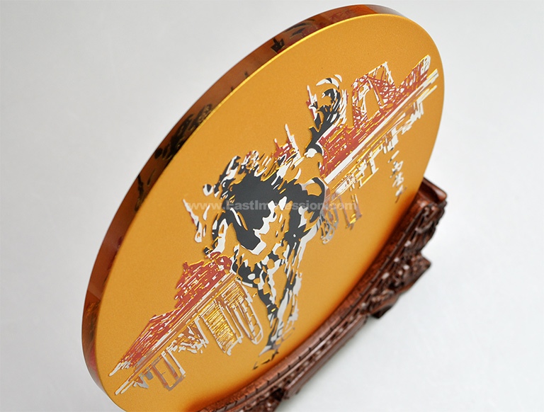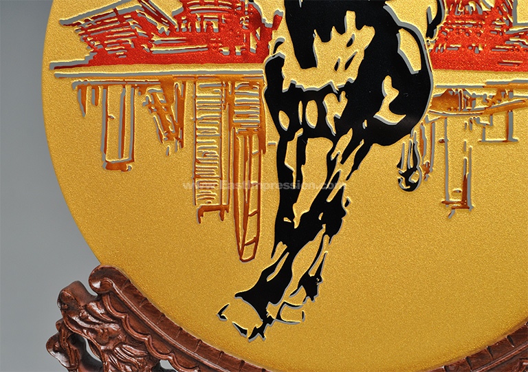 “一马当先”赏盘以纯正的富贵金衬底,在对称的玻璃表面精雕细刻,形成了奇妙的镂空现象。