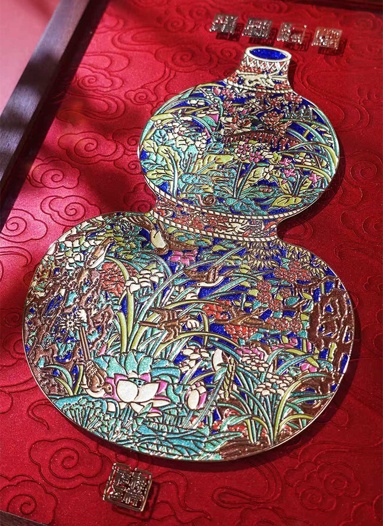 源于元代花鸟画巨擘陈琳的《葫芦花瓶图》,将专供宫廷挂设之用的铺殿花鸟画限定在葫芦形的花瓶中,金凤祥龙,青松竹节、牡丹荔枝呼应交叠,百花齐放、百草丰美,画面生机盎然且富丽堂皇,“乾坤”与“器”融为一身,观之万象峥嵘,得富贵长春之喜,享福禄永寿之祥。