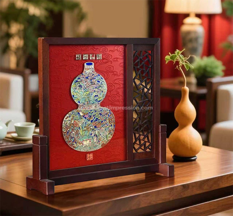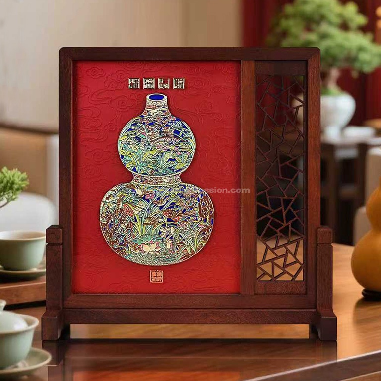 台屏一侧实木镂雕冰裂纹,寓意岁岁平安。镂雕的“虚”与掐丝晶雕手绘的“实”,比例协调、色彩与工艺鲜明对比,形成虚实相生、主辅和谐的艺术美感。