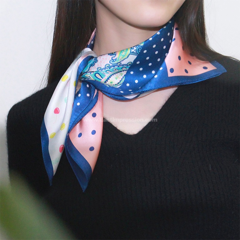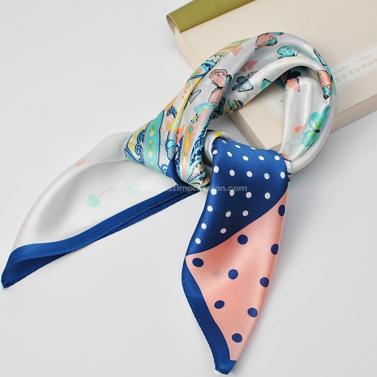 丝巾散发着珍珠般柔和的光泽,表面平整光洁,触感细腻丝滑。构图新颖别致,波点纹、腰果纹、彩蝶有序呈现,配色绚丽多彩,将波点的灵动俏皮与繁复华丽的腰果纹、彩蝶翻飞的春景相融合,美不胜收。