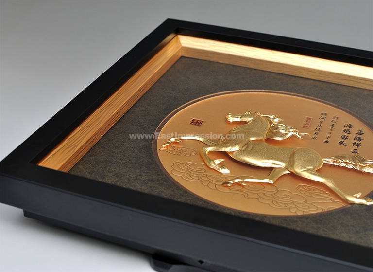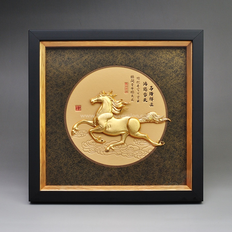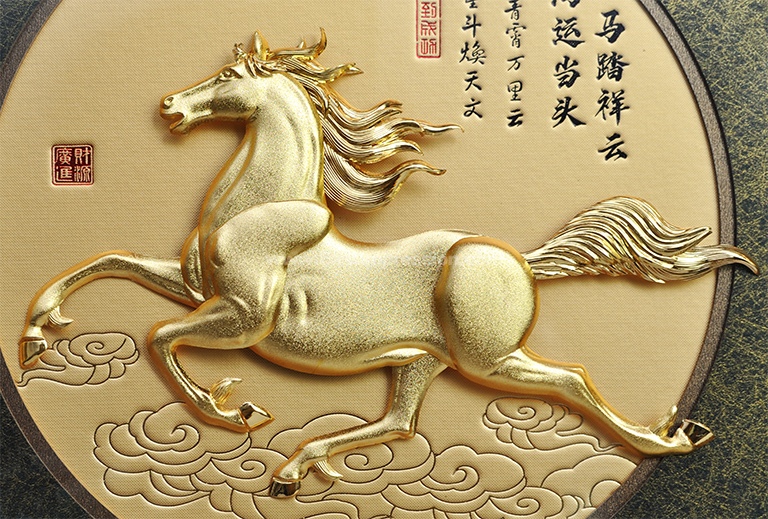 “马踏祥云”立体金箔材料由台湾进口,金箔采用高纯度金箔制作,表面金属含金量Au999‰。由于黄金的稀有和珍贵,金箔装饰也成了尊贵奢华的象征,具有色泽光亮、厚度均匀、经久不变色的特点。