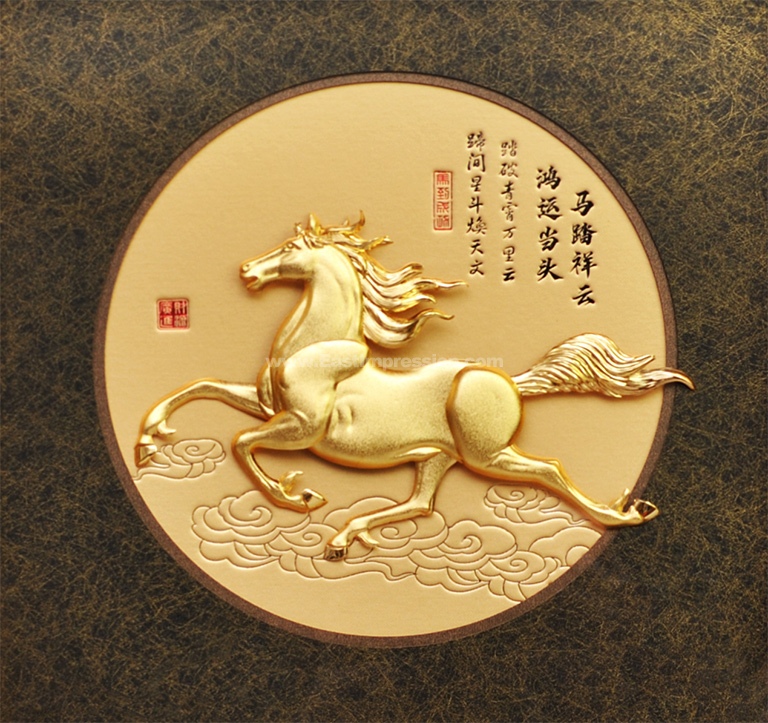 “马踏祥云”立体金箔形象以圆形“开窗”突出呈现,背景采用金色压纹纸,祥云纹、“马到成功”与“财源广进”印章均采用烫金工艺,以金衬金,愈加华丽高贵。