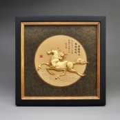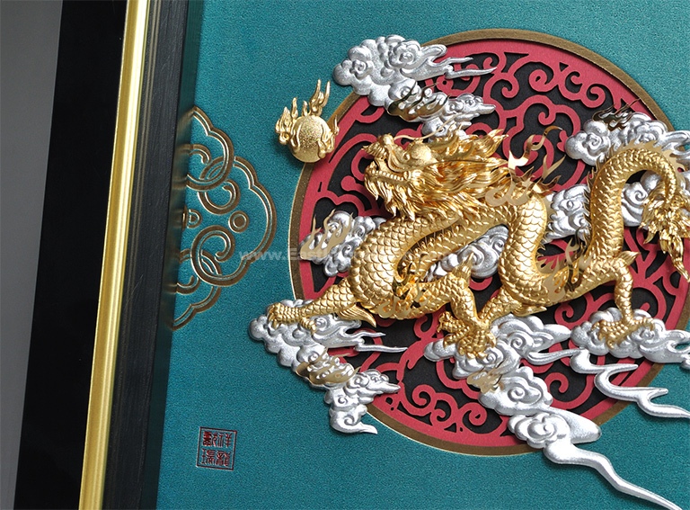 “祥龙献瑞”立体金箔材料由台湾进口,金箔采用高纯度金箔制作,表面金属含金量Au999‰。由于黄金的稀有和珍贵,金箔装饰也成了尊贵奢华的象征,具有色泽光亮、厚度均匀、经久不变色的特点。