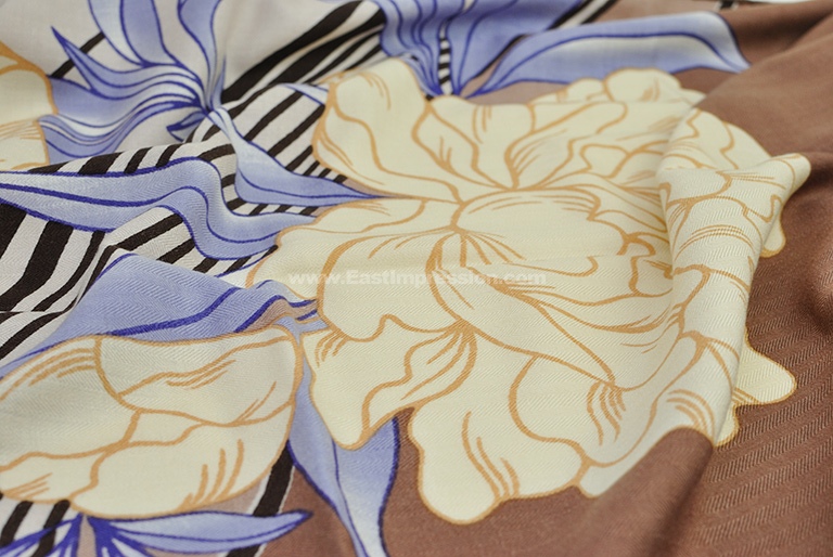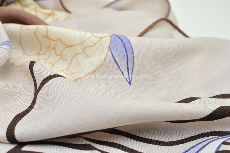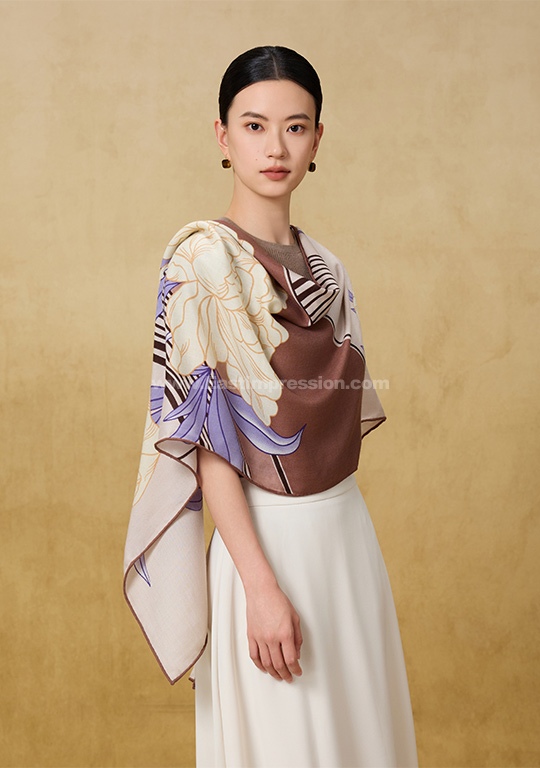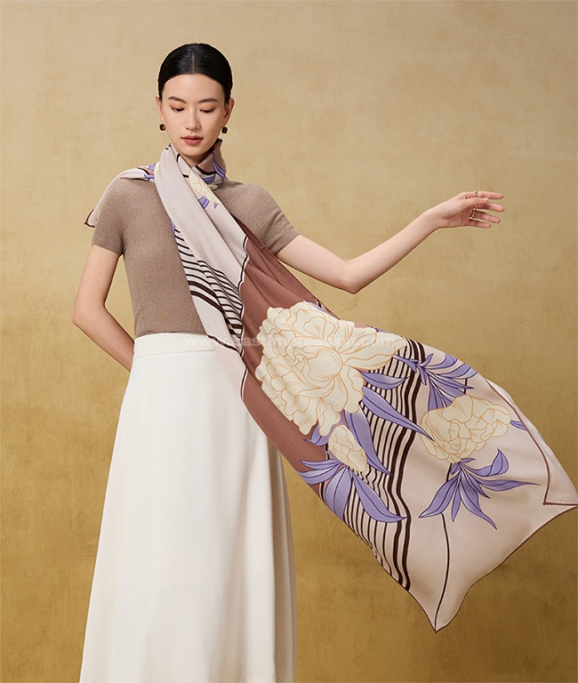 米棕、巧克力棕、摩卡棕等棕色系因面积大小、构图方式等巧妙呈现在围巾上,紫色的叶片勾勒提升了色彩的注目度,浅黄与棕黄的碧桃花朵注入了温暖的色调。